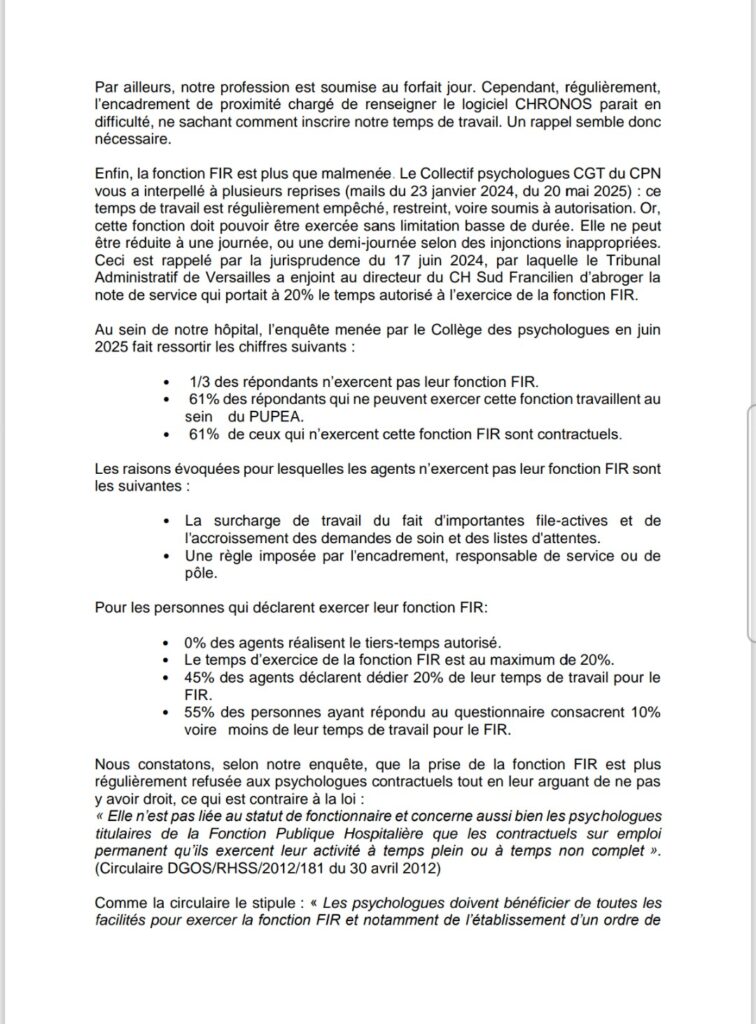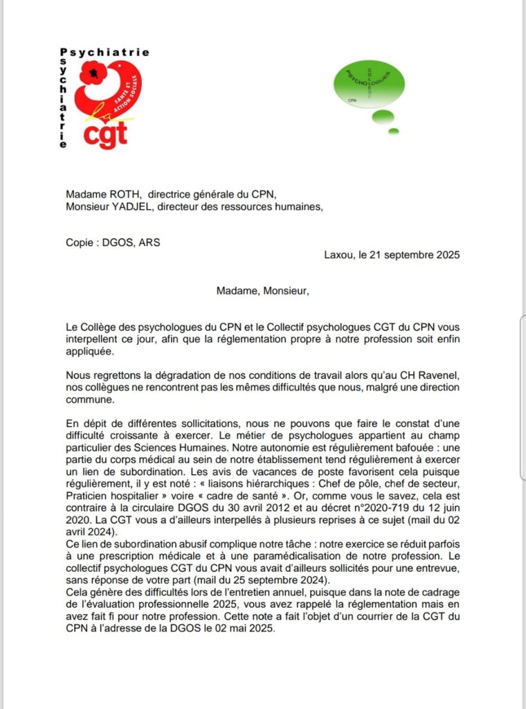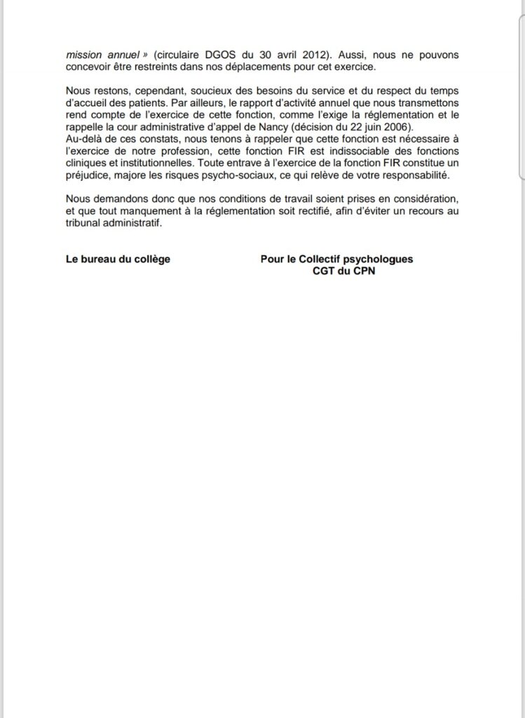 Preuve que la situation doit être prise enfin au sérieux par la Direction du CPN, le collège des psychologues et le collectif CGT des psychologues ont co-signé le courrier ci-dessous :