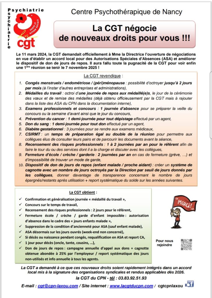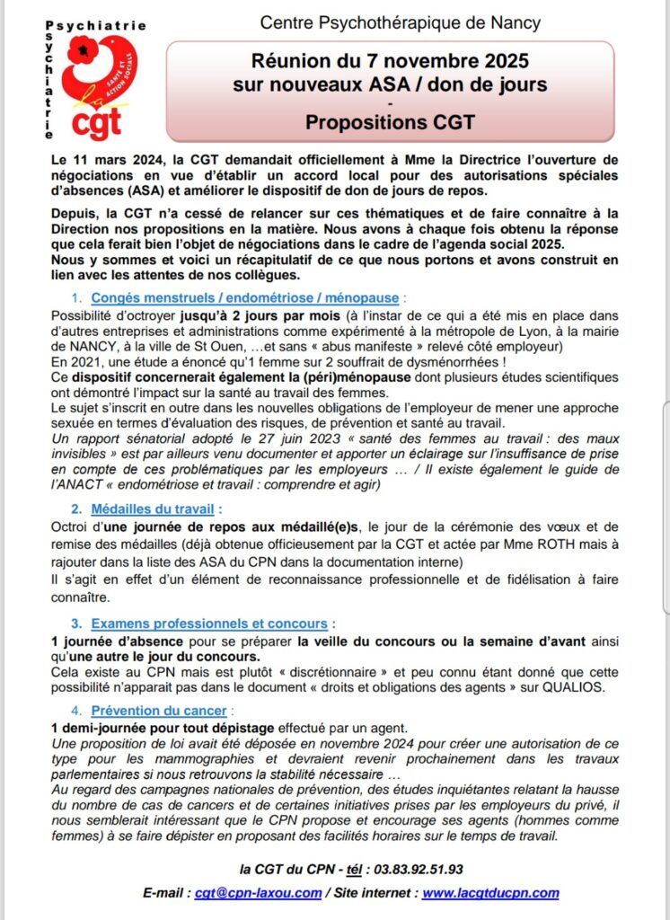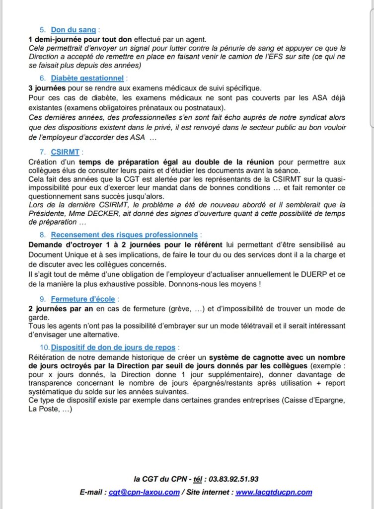 Le 11 mars 2024, la CGT a écrit à la Directrice du CPN pour ouvrir une négociation spécifique autour des ASA et du don de jours de repos. Il aura fallu toute notre pugnacité pour obtenir enfin une réunion avec la DRH le 7 novembre 2025. La CGT du CPN a été la seule organisation syndicale à avoir préparé un document écrit détaillant nos revendications basées sur les demandes formulées par nos collègues au fil des ans (cf ci-après).