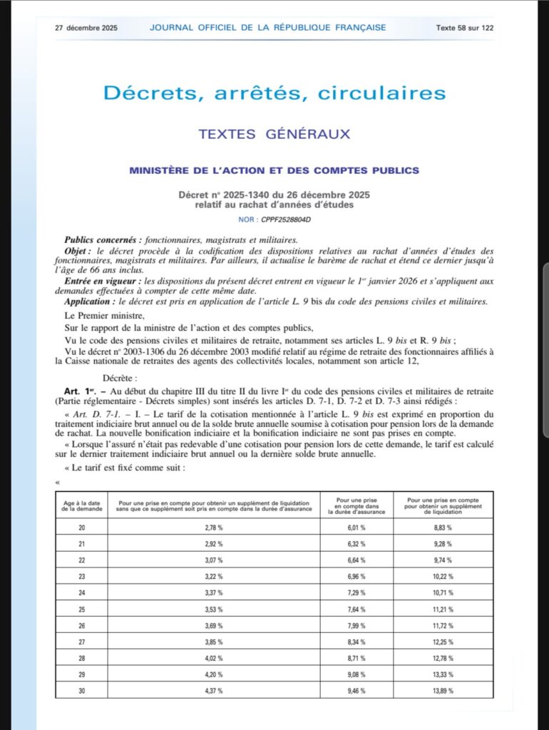 Lien vers le décret : Décret n° 2025-1340 du 26 décembre 2025 relatif au rachat d’années d’études – Légifrance