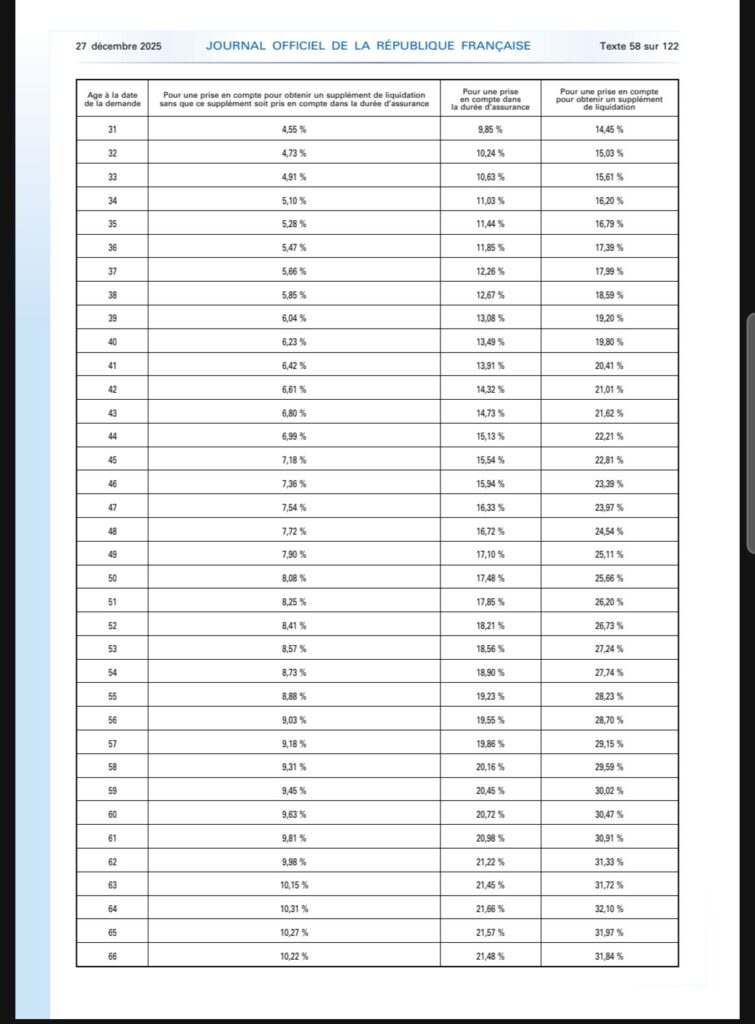 Le tableau du décret du 26 décembre 2025 détaillant en fonction de l’âge et des 3 options possibles en termes de rachat (en pourcentage de votre traitement brut annuel) :
